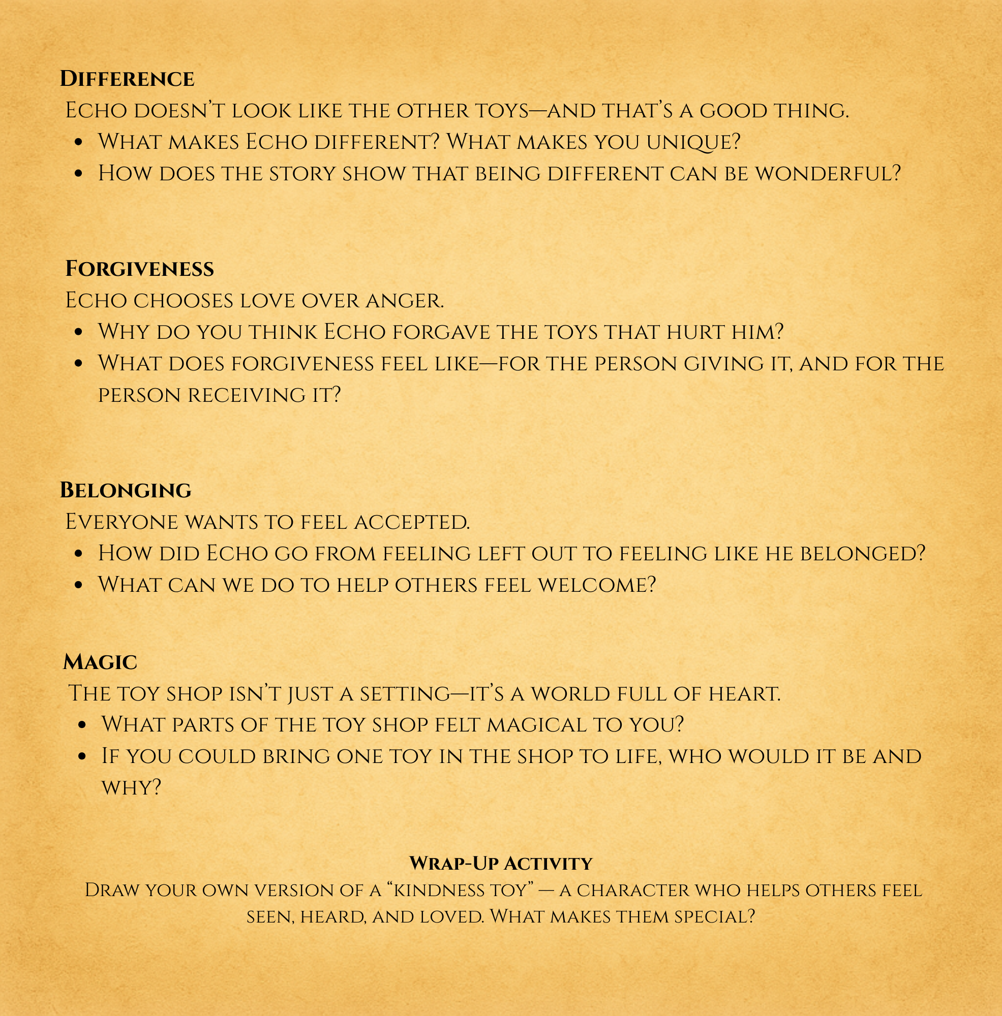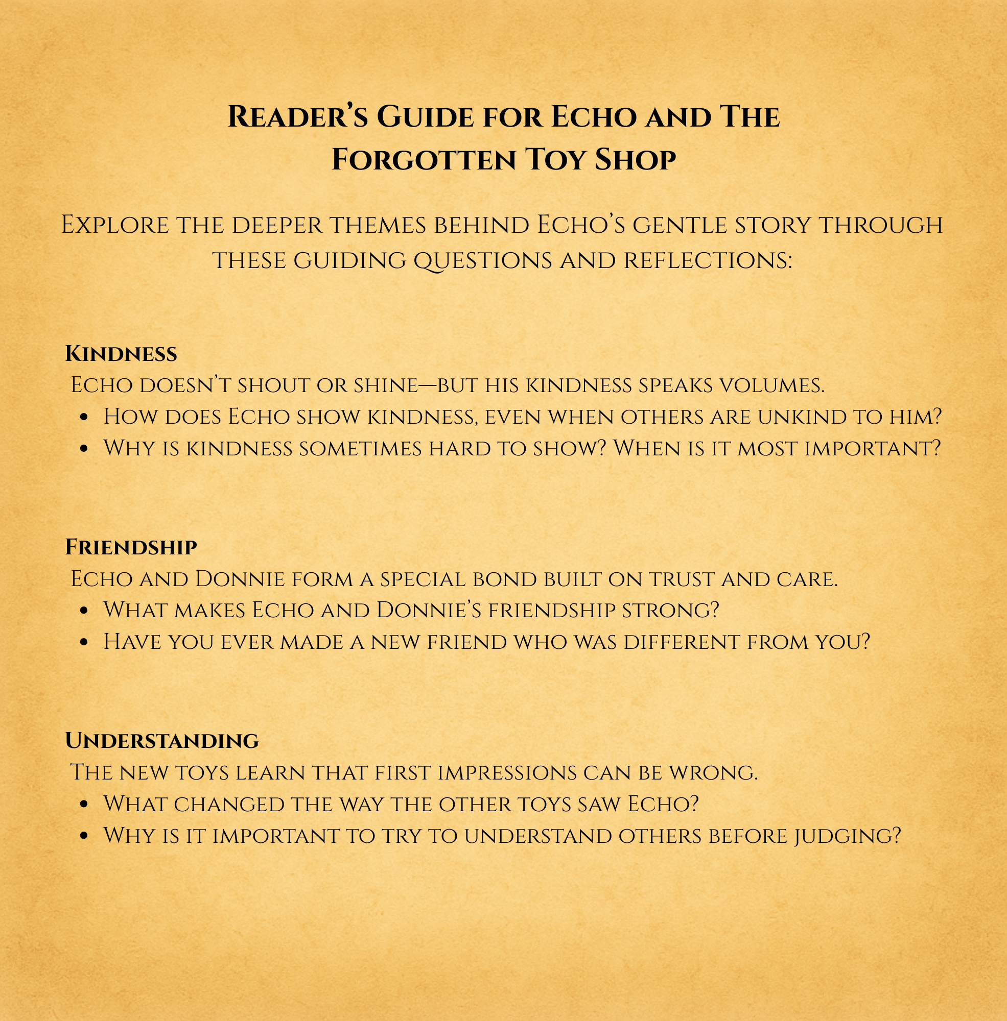 This Reading Guide offers reflective questions and activities that support deeper comprehension and emotional learning. After reading, revisit these prompts to encourage discussion, reinforce key ideas, and extend your child’s engagement with Echo’s adventure.