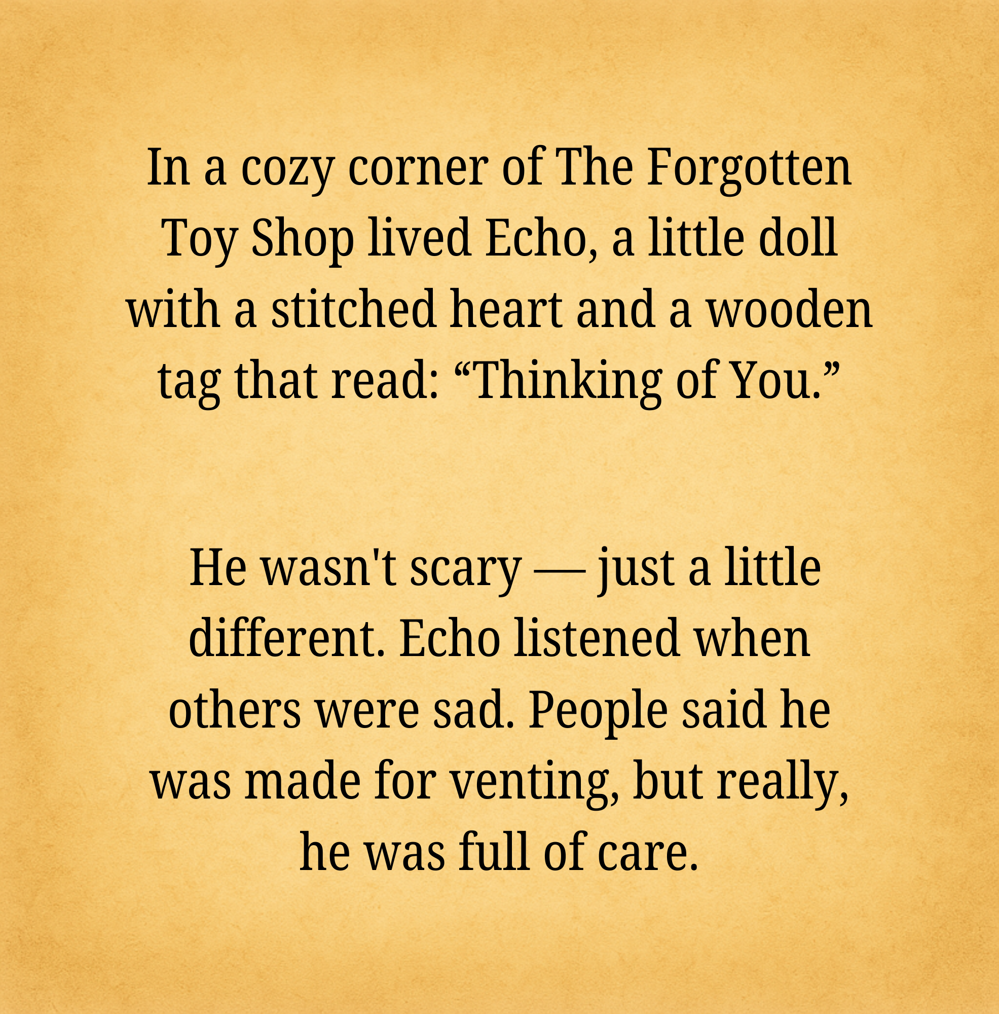 *Echo and the Forgotten Toy Shop* is a beautifully illustrated children's book that follows a brave little doll named Echo and his best friend Donnie as they uncover the magic hidden in an old toy shop.