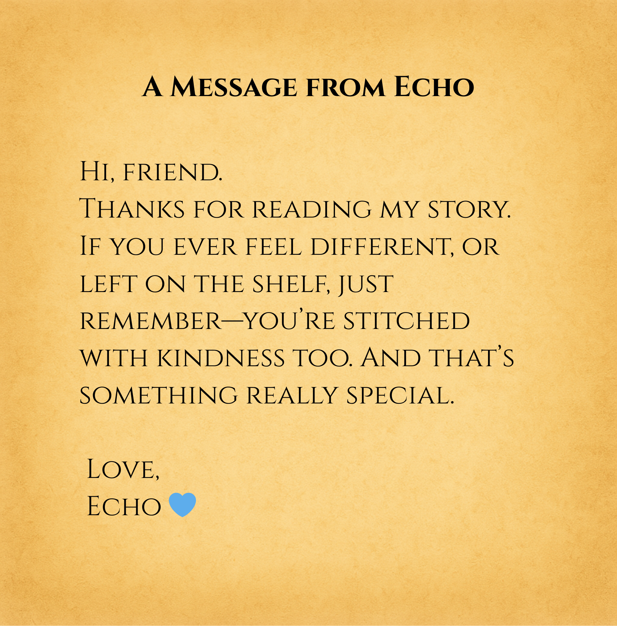 Thank you for taking Echo’s story home. If it made you smile or sparked a conversation, please consider leaving a review on Amazon. You can leave a review even if you purchased the book in person or through a local event—your support truly makes a difference.